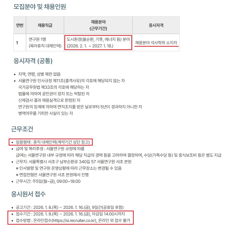 도시환경(물.가후/에너지 둥)분야 2026.02.01~ 2027.01.18 근무 임용형태: 휴직대체인력